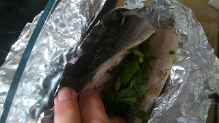 Na wiosnę, lato przyjemnie nie męczyć się długo w kuchni, gdy gorąco. Nie smażę rybki (z lokalnegorolnika.pl , słodkowodnej), tylko piekę w naczyniu żaroodpornym, z nadzieniem z ziół. Kroję wszystko co wyrosło, z wyjątkiem mięty i szczypiorku choć, może i tak warto spróbować? .. ja dodałam jednak: