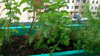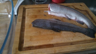 Na wiosnę, lato przyjemnie nie męczyć się długo w kuchni, gdy gorąco. Nie smażę rybki (z lokalnegorolnika.pl , słodkowodnej), tylko piekę w naczyniu żaroodpornym, z nadzieniem z ziół. Kroję wszystko co wyrosło, z wyjątkiem mięty i szczypiorku choć, może i tak warto spróbować? .. ja dodałam jednak:
