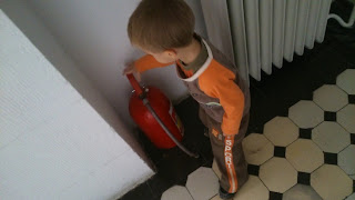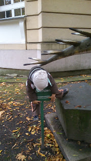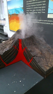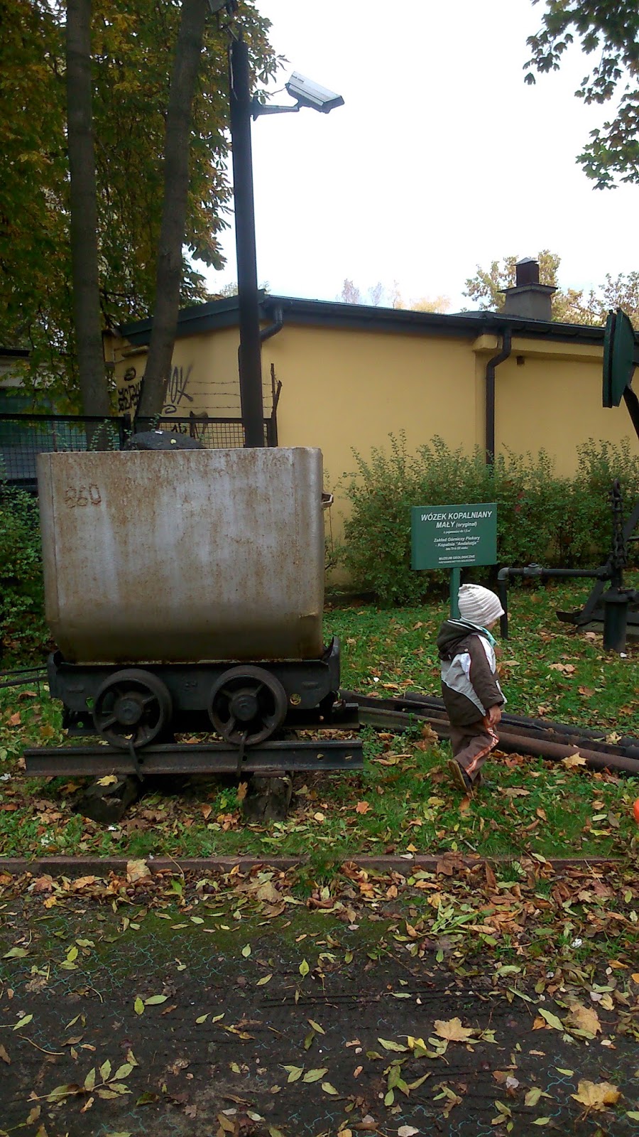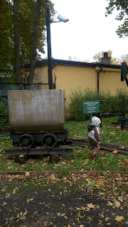 Ciekawie : owłosiony (upierzony?) dinozaur, kości mamuta, ogromny globus, niebieska sól, jaskinia do obejrzenia, różowa sól polska jak himalajska, książki pomysłowe o powstaniu bursztynu i o mamutach (sensoryczne),duże tablice pokazujące rozdzielające się kontynenty… Oczywiście dla młodszego syna kabelki, żarówki w gablotach i łazienka oraz gaśnice równie ciekawe jak inne eksponaty, dalej – kolejka z węglem na zewnątrz i głazy do skakania po nich, i całe mnóstwo kasztanów. 🙂
