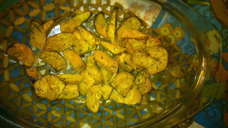 w drugim naczyniu żaroodpornym robimy pieczone bataty – kroi się batata w drobne kawałki, można wymieszać z sosem w misce gdzie robiliśmy nadzienie, dodać oliwy